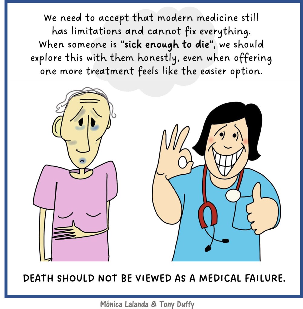 Most people when asked would prefer to die in their own home, yet most people still die in hospital. Deaths in hospital are often viewed in a negative light or even a failure, but for many people, hospital is still the right place to die. For some people, admission to hospital at end of life is unavoidable due to family distress, symptom burden or 24-h social care gaps. Despite the pressured, noisy, exposed environment of the hospital, there are countless daily examples of excellent end-of-life care.