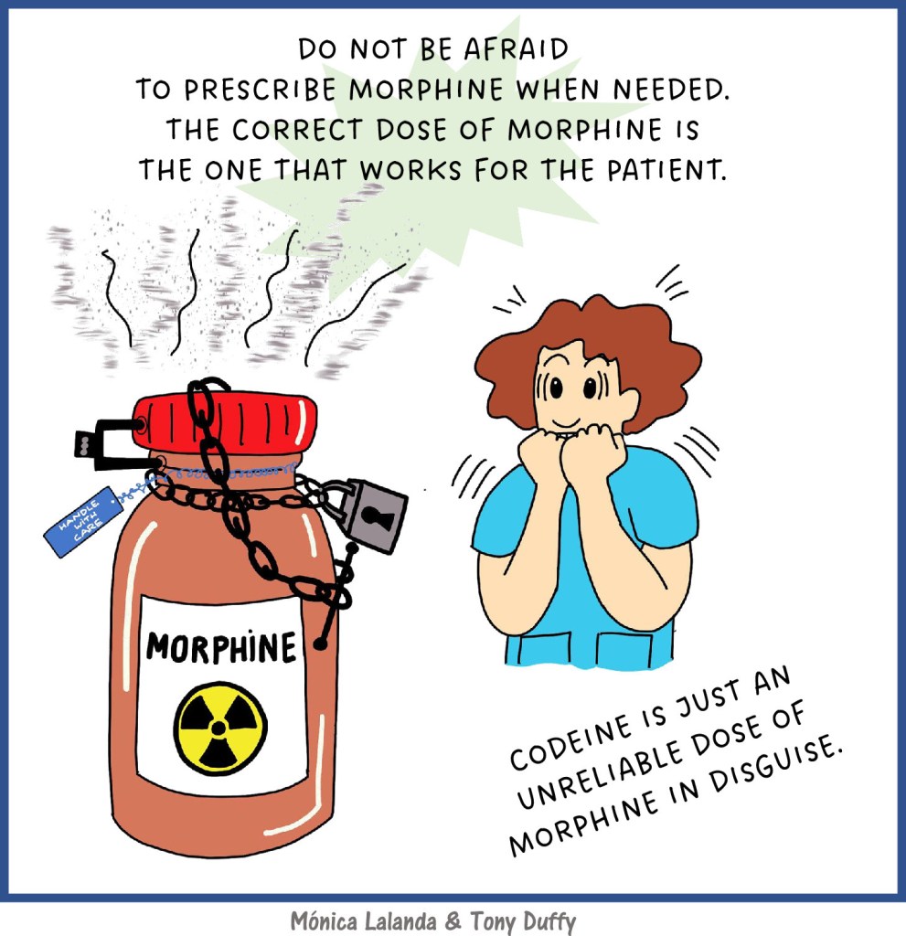 The term ‘weak opioid’ in relation to codeine is a misnomer, as all opioids carry the same side-effects and risks. Approximately 10% of an oral codeine dose is metabolised by cytochrome CYP 2D6 to morphine to produce its analgesic effects. Poor metabolisers (up to 10% of the population) gain minimal pain relief, while ultra-rapid metabolisers (10–30% of people depending on ethnicity) and young children can produce dangerously high levels of morphine. The WHO three-step analgesic ladder with codeine on step two has been shown to be unnecessary when there is ready access to low-dose morphine. There are increasing numbers of opioid analgesics available, but morphine remains the first-line choice and has been shown to be safe, effective and cost-effective.9 Don’t forget that all opioids cause constipation, so concurrent prescription of a laxative is useful.