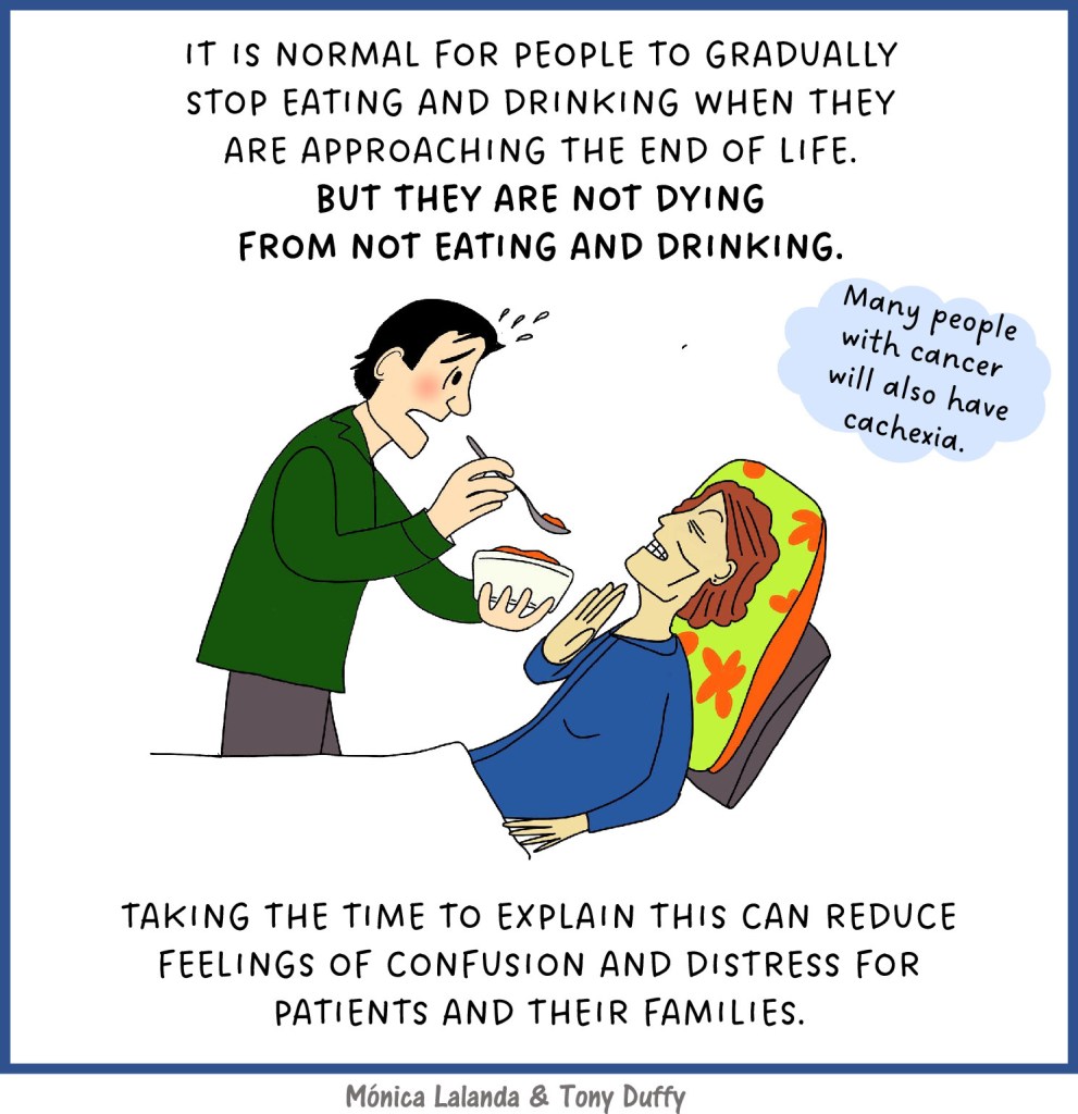 When people are dying, their desire for nutrition wanes naturally; most people eventually become unable to eat or drink due to weakness and sleeping. This normal pattern is predictable and almost universal. Letting dying patients and their families know what to expect can help dispel significant distress. Concern over trying to ‘build the person up’, that they have ‘given up’ or that they are ‘starving to death’ are common.