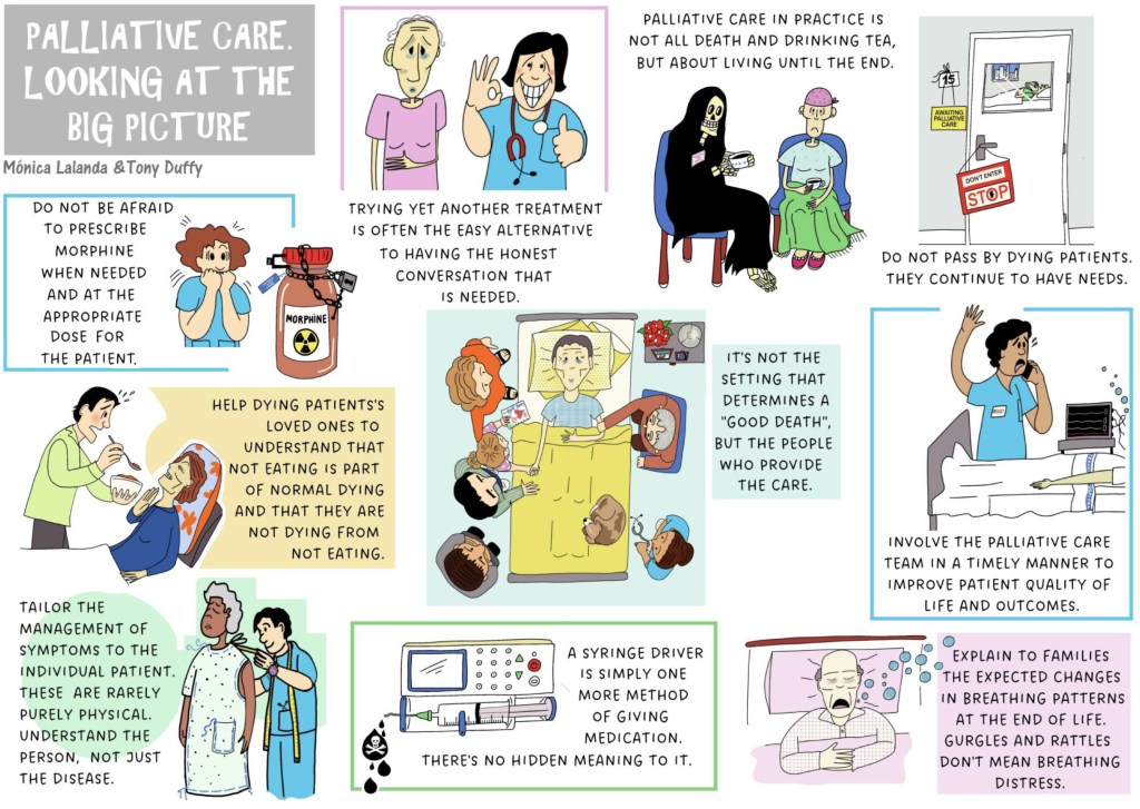 Despite decades of clinical practice, education and integration with other healthcare teams, palliative care remains enshrouded by myth and misconception. Through the powerful medium of comics, this article presents ten of the most misunderstood areas in palliative care. The topics explored were produced in conjunction with practising UK palliative care trainee doctors and realised to artistic form by a physician expert in graphic medicine. A novel infographic approach was carefully developed to be approachable yet thought-provoking. Each infographic is paired with content created to encourage reflection and provide applicable, real-world palliative care advice for all healthcare professionals. The historical connection between art and medicine is utilised in this modern article with the goal of improving patient care.